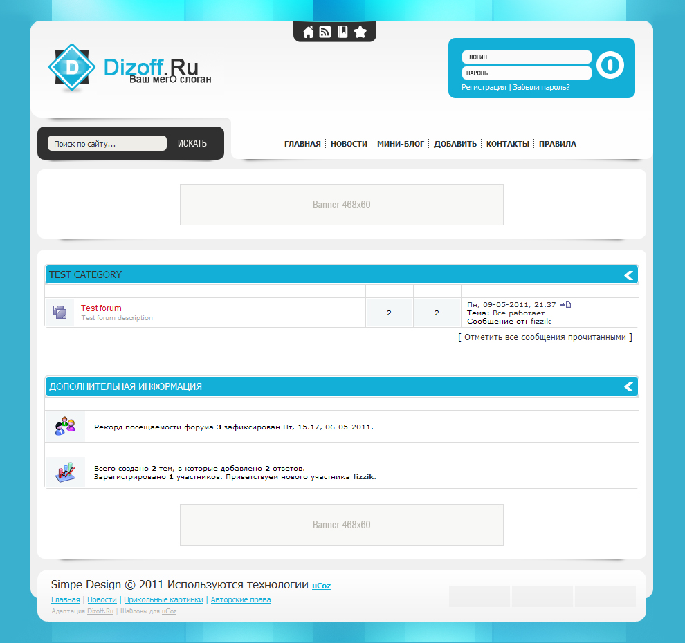 Название: Simple Design - адаптация для юкоз Цветовая гамма: Голубой, черный, белый Кроссбраузерность: Opera, Mozilla FireFox, Google Chrome, Safari, в IE отображается неккоректно! Комплектация архива: Html, CSS, Файлы, PSD-макет Конструктор(Да;Нет): Да Баги(Да;Нет): Нет Описание:Обалденный шаблон, адаптация с DLE. Имеет два вида профиля и psd макет